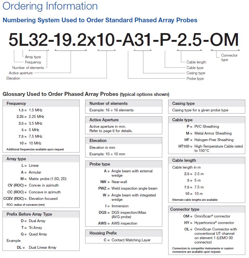 Phased array prober har faste kabler. Der findes forskellige typer af forlængerkabler, Y-splittere og splitter boxe for tilslutning af flere prober til samme instrument. Standard stikket OM passer til OmniScan og Focus PX phased array instrumenter.